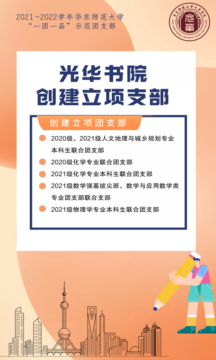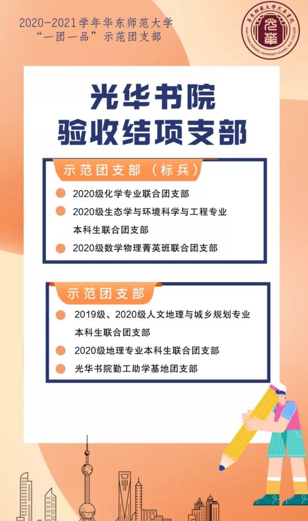 华东师范大学光华书院2019级、2020级人文地理与城乡规划专业本科生联合团支部在2020-2021学年成为了“一团一品”创建支部。该联合团支部以提高团支部成员思想政治素质为核心,以建设团支部公众号为载体,以丰富多彩的团支部活动为主线,以加强团支部内部建设为保证,五育并举,互帮互助,同心协力,使团员树牢“四个意识”,坚定“四个自信”,切实增强思想自觉、政治自觉、行动自觉,做新时代的新青年。该联合团支部在“一团一品”的建设中形成了团结向上、不断进取、与时俱进的良好团风。