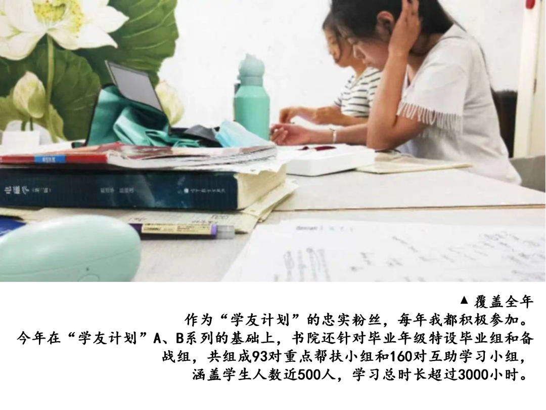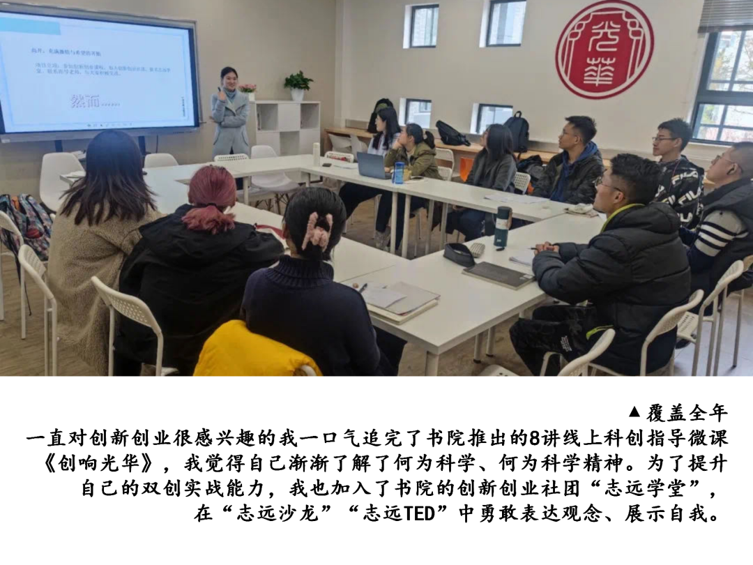 疫情期间,在家学习,我也难免会有些懈怠。为了激励自己持续学习,我参加了书院组织的学友计划,和小伙伴一起抵制“在家的诱惑”。返校之后,我积极参加各类科创和竞赛活动,不断提升自己的创新思维和科学素养;书院组织的各种生涯启航活动也让我渐渐从对自我否定、对专业和未来的迷茫中走出,明确了自己的目标和方向。