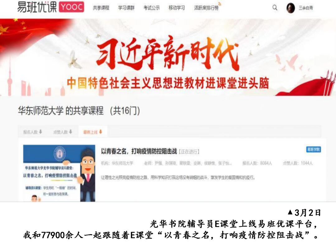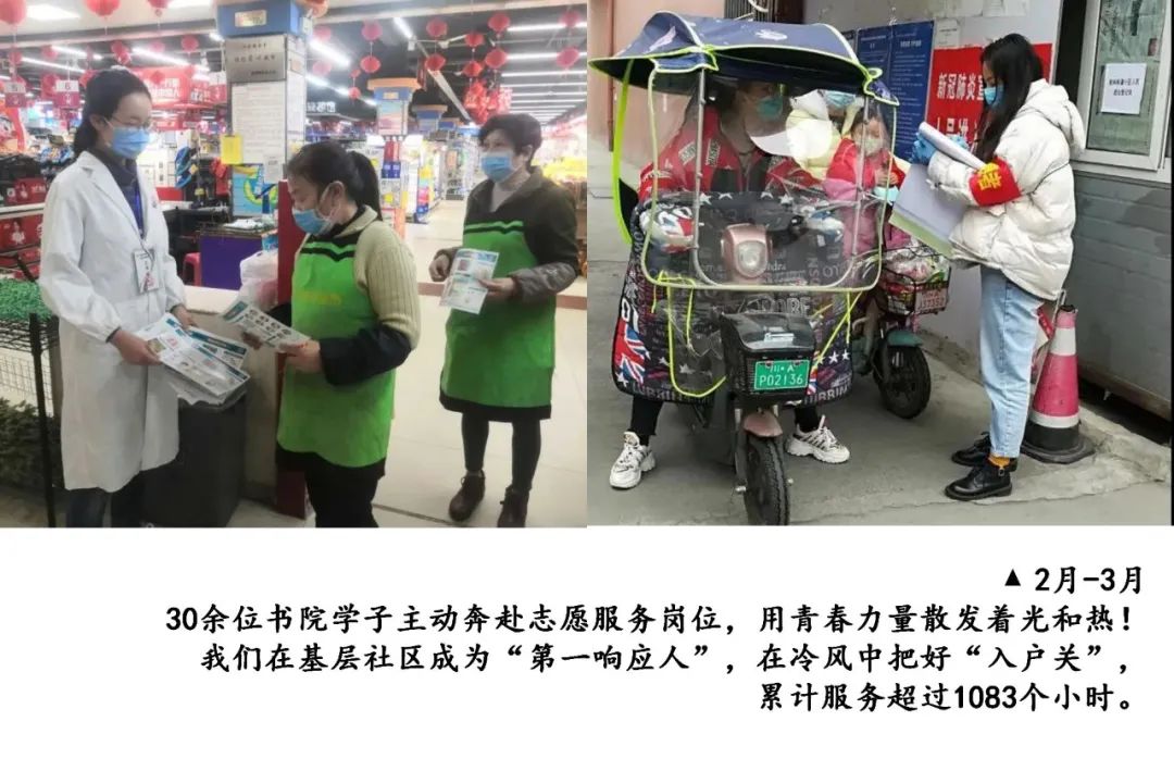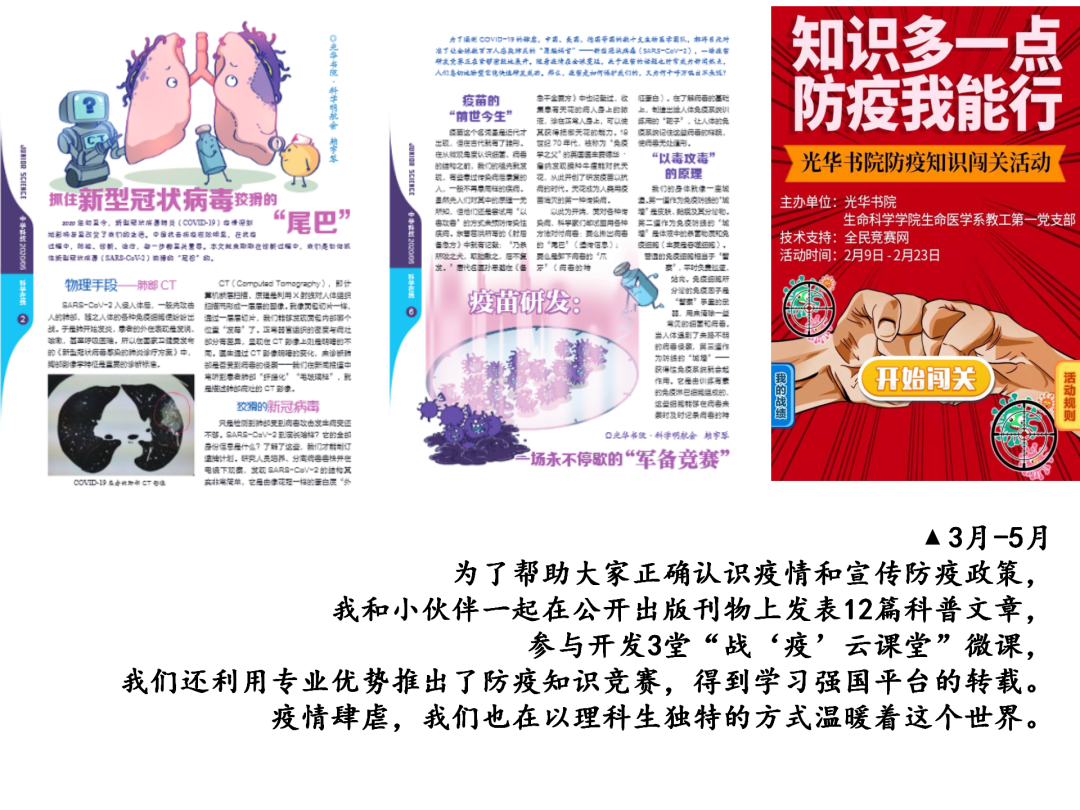 春节的喜庆被新冠肺炎疫情骤然打破,白衣铸成人间天使,与病魔赛跑;封城不能封住真心、温情,众志成城、迅速有效地防控措施,见证了中国力量。看着每天都在攀升的确诊人数,我百般焦灼、迫不及待地和我的朋友们也走进社区参与志愿防疫,传递光华温暖。在书院的防疫微课中,我感受到了师长关怀;一篇篇科普文章,是我们作为理科学子以才报国的方式;一张张战疫海报,亦彰显了我们国之青年的家国情深……