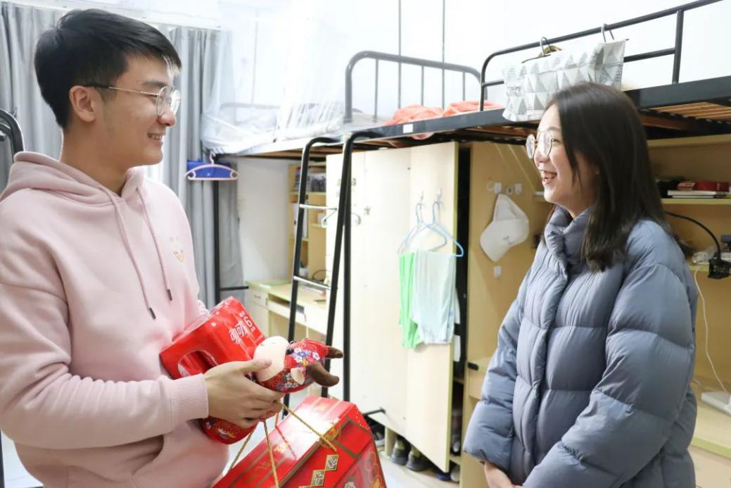 辅导员涂皘、史琳和孙瑛琦走访了学生宿舍,为留校同学送去新年大礼包