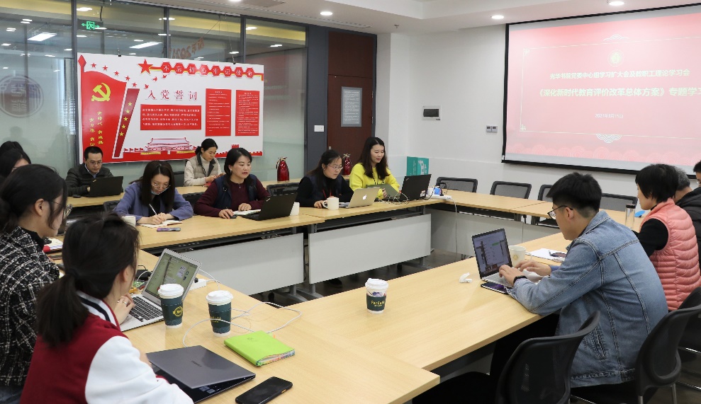 2021年3月15日,光华书院开展党委中心组(扩大)理论学习及教职工理论学习会,围绕《深化新时代教育评价改革总体方案》及书院中心工作展开学习研讨。