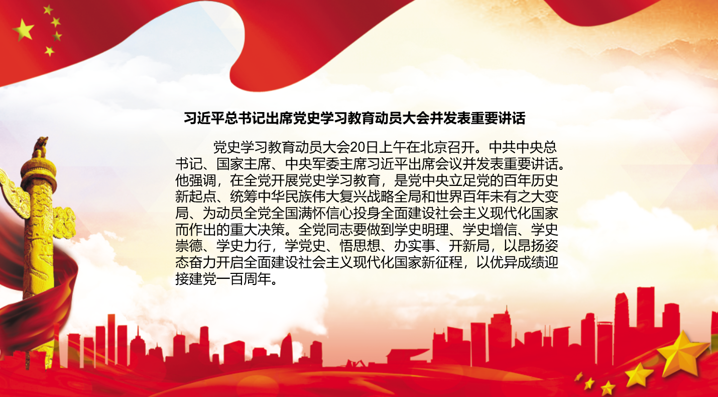 胸怀千秋伟业,恰是百年风华。“全党同志要做到学史明理、学史增信、学史崇德、学史力行,学党史、悟思想、办实事、开新局,以昂扬姿态奋力开启全面建设社会主义现代化国家新征程,以优异成绩迎接建党一百周年。”今年2月20日,习近平总书记在党史学习教育动员大会上发表重要讲话,深刻阐述了开展党史学习教育的重大意义,深刻阐明了党史学习教育的重点和工作要求,对党史学习教育进行了全面动员和部署,为我们开展好党史学习教育指明了方向,提供了根本遵循。