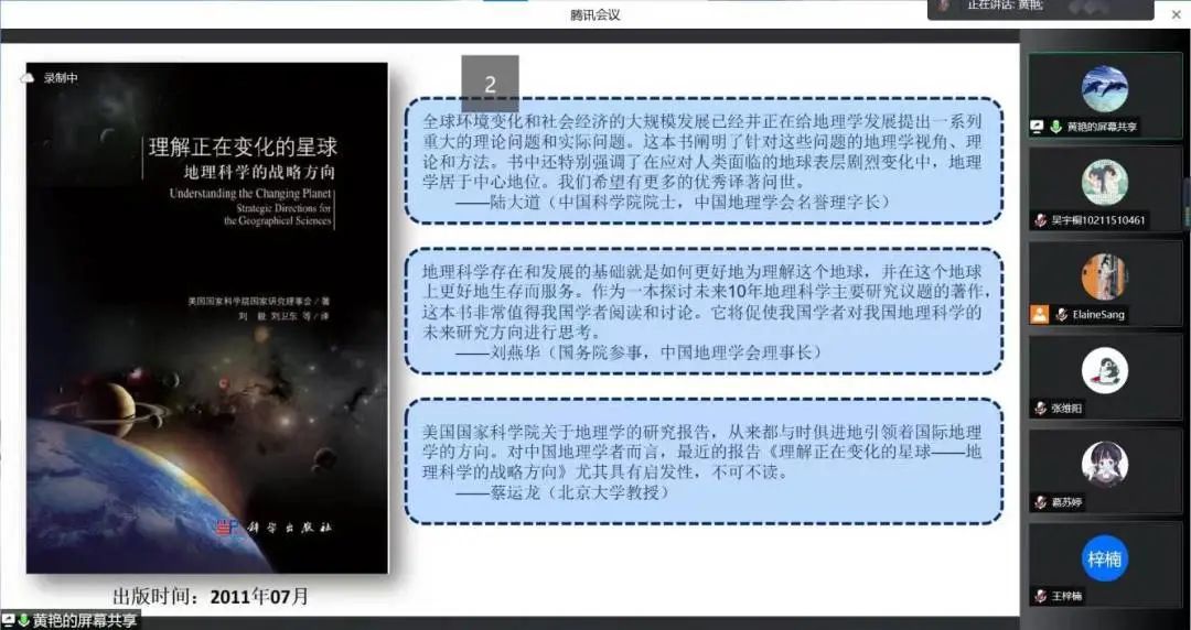 黄艳老师分享了本书所聚焦的地理科学近十年四大现有学术战略方向,并重点关注新领域的问题。黄老师认为,阅读本书不但能解答目前重点关注的环境、经济、社会相关问题,也能够启示学生更早接触学术前沿方向,打开眼界,审视我们的研究为星球带来影响的可能性。