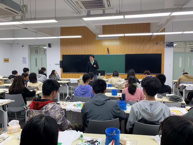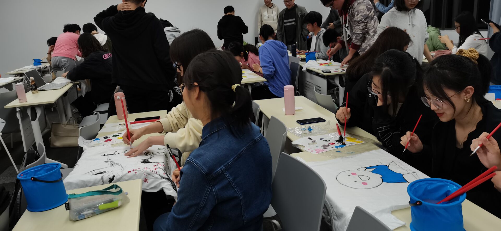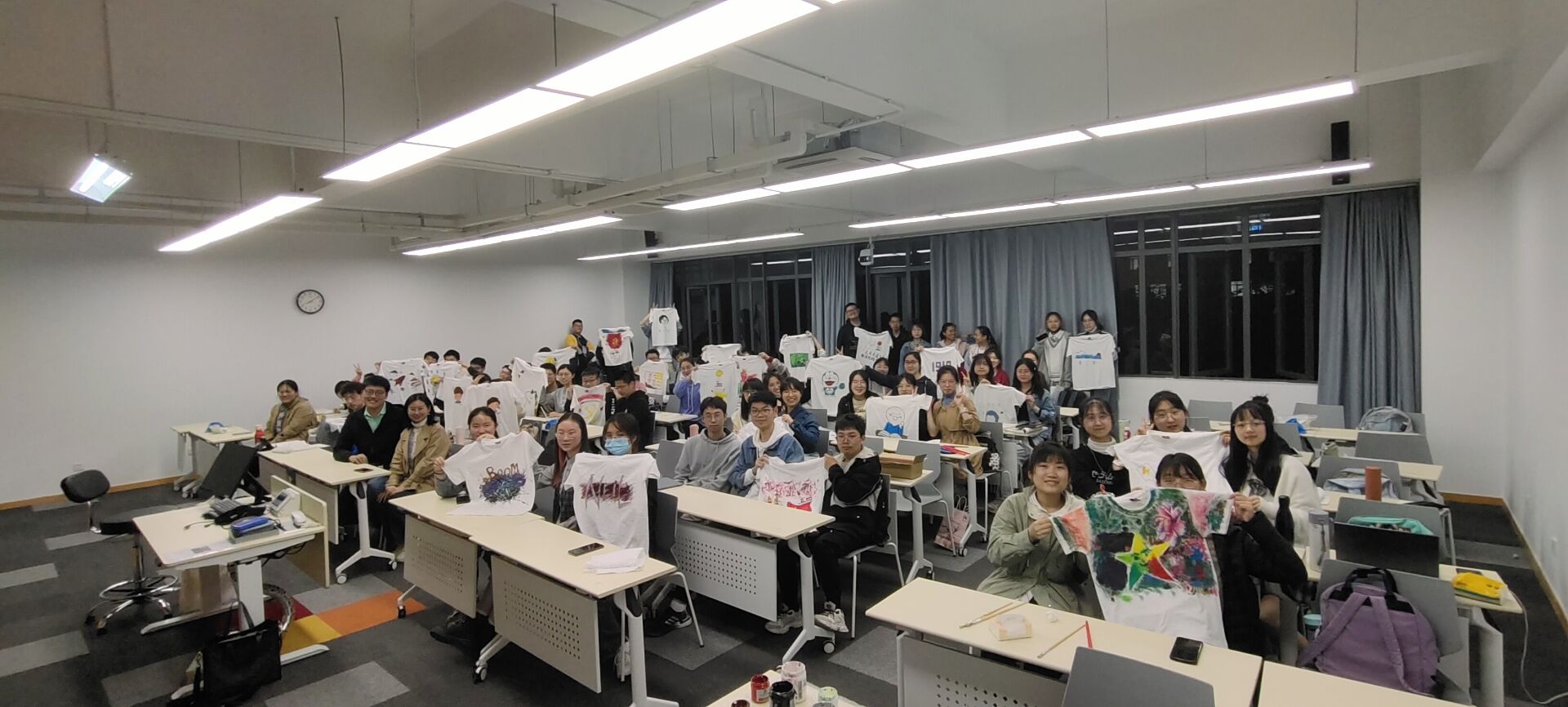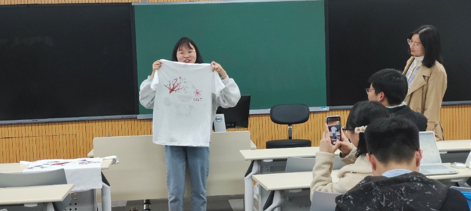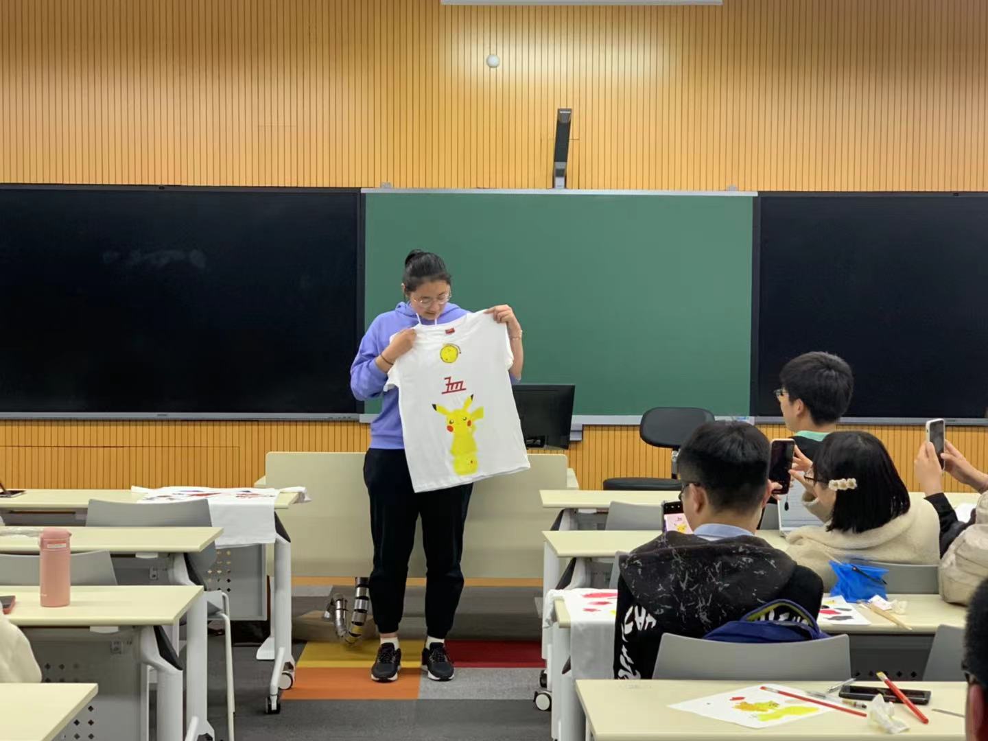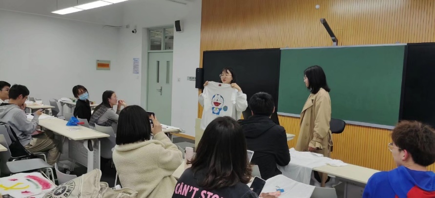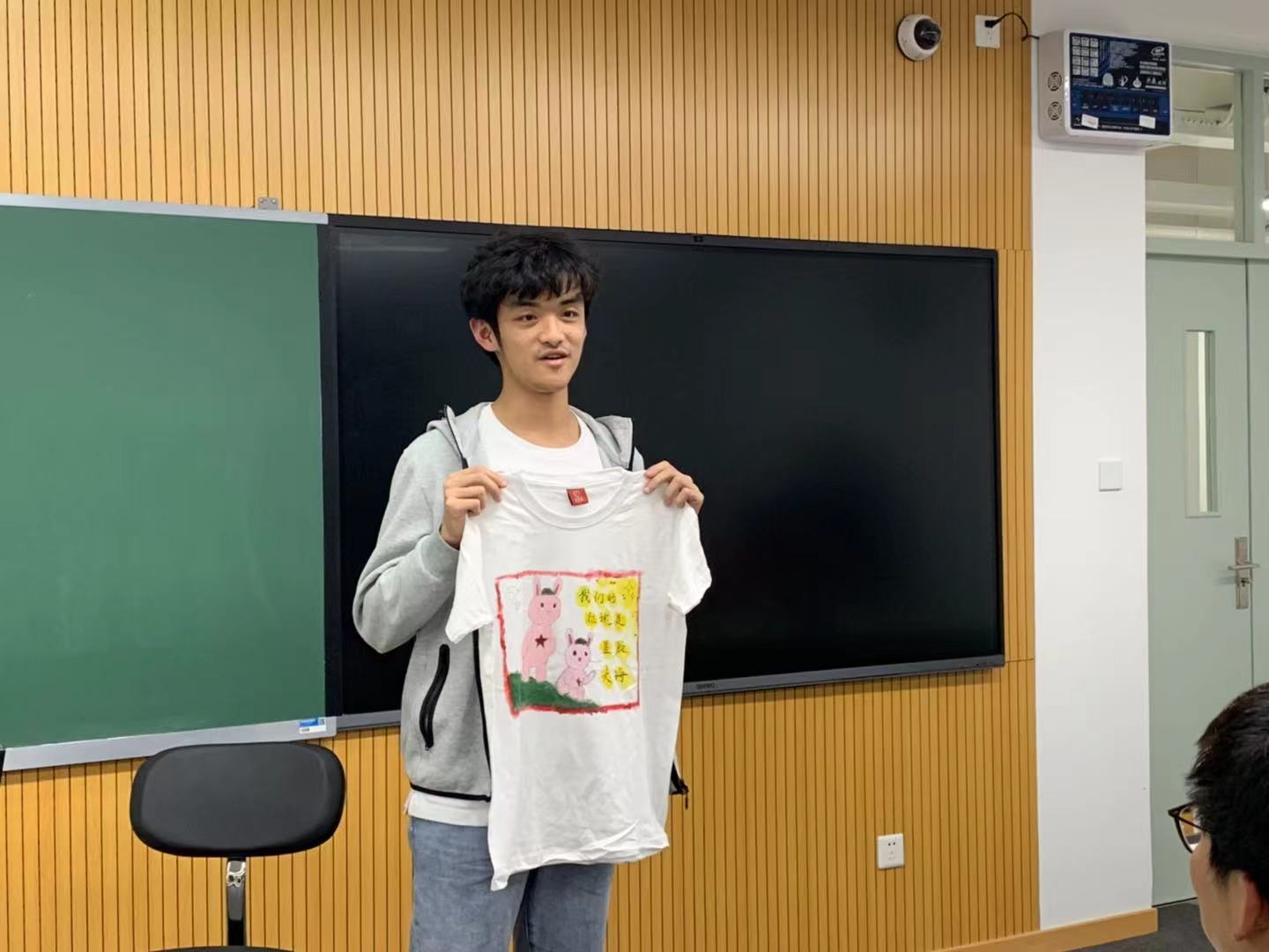 20级地理信息科学专业班长高诗敏对五四运动的历史背景和精神内核进行了讲解,帮助同学们更好地领悟五四精神及其新时代意义。为了充分调动同学们的积极性,达到寓教于乐的效果,本次团日活动增添了五四主题文化衫创作环节,将德育与美育相结合。20级地理科学专业团支书王露瑶先介绍了文化衫的绘制方法及注意事项。而后,同学们几人成组,发挥各自的想象力与创造力,用画笔和颜料在白色T恤上绘制出了各种美丽精致的图案,展现着青春风采和他们心中对于五四精神的理解与体会。