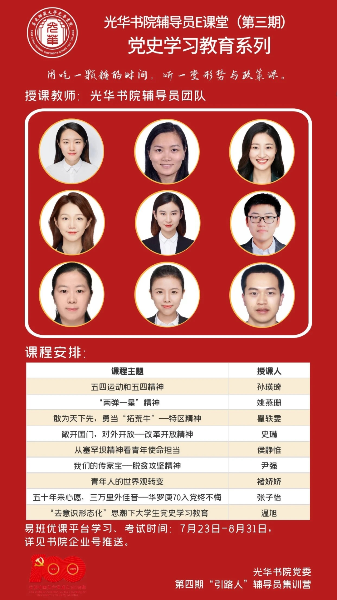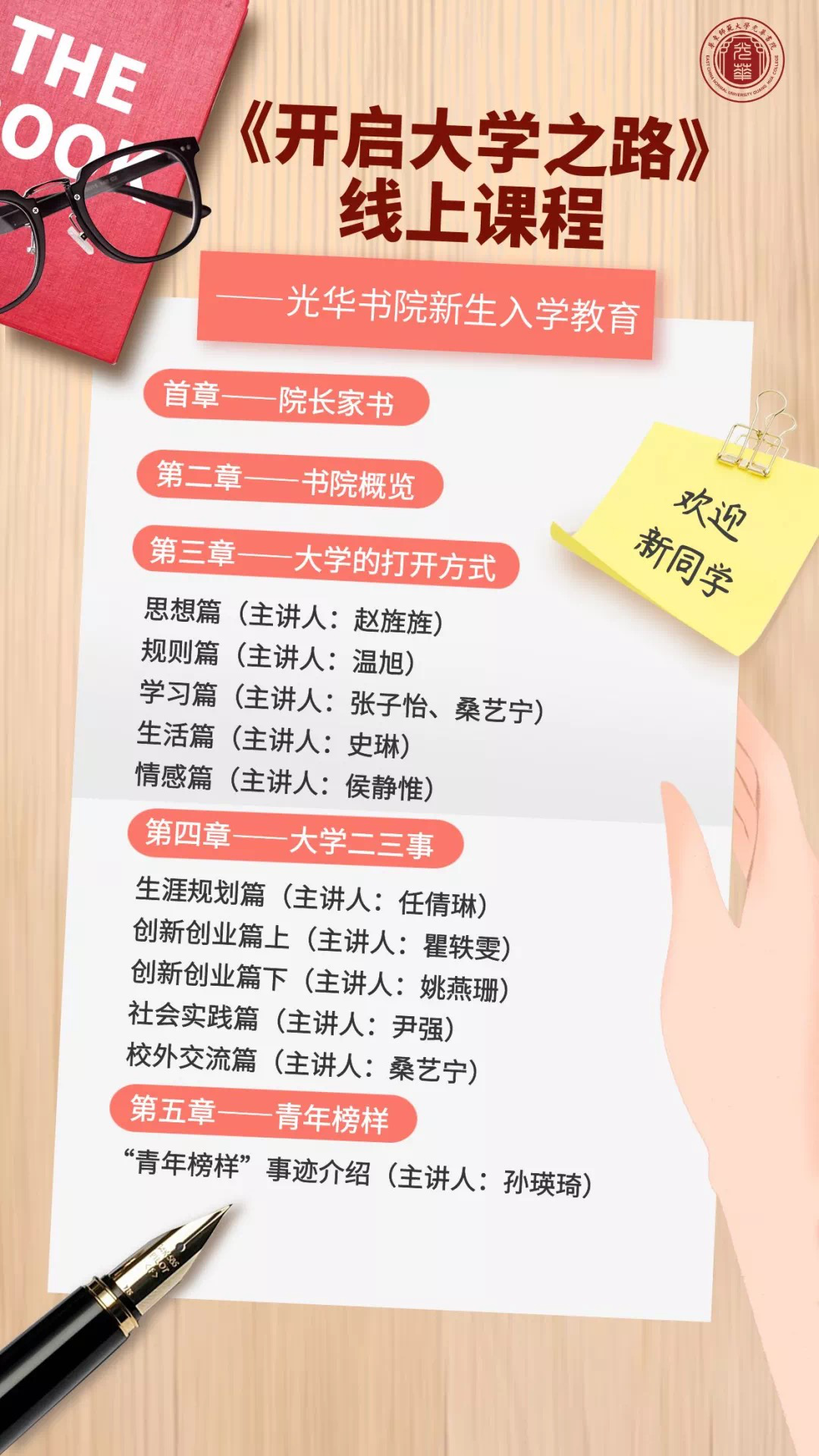 除了新生入学教育主题班会之外,光华书院还依托大夏学堂开设《开启大学之路》线上微课,依托易班优课开设“辅导员E课堂(第三期):党史学习教育”,拓展线上线下育人双载体,帮助新生走好大学第一步,扣好人生第一粒扣子。