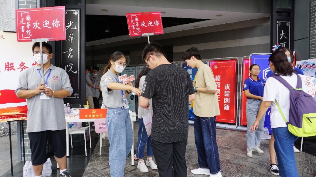 学生党员们从一大早就搭建好了光华书院学生党员服务岗,准备好迎接新生的到来。从学生发展空间门口测温的滴答声、到人群中疏导人流的身影,抑或是学生党员服务站亲切耐心为新生答疑的笑容,无一不体现着光华书院师生党员的温暖与热情。