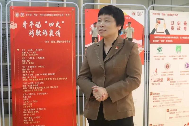光华书院教工党支部书记褚娇娇主持活动并介绍了本次展览的基本情况;书院学生第二党支部党员郑惠宁、第三党支部党员赖宇琴、学生第一党支部入党积极分子缪昳闻,从发展、见证、传承三个方面引导大家参观了展览;策展人尹强老师为大家解读了19级数学专业的陈欣蔚创作的《从石库门到天安门》,从作品的解读反映学习教育的成效;书院辅导员侯静惟老师介绍了青年说“四史”暑期社会实践活动的整体情况。